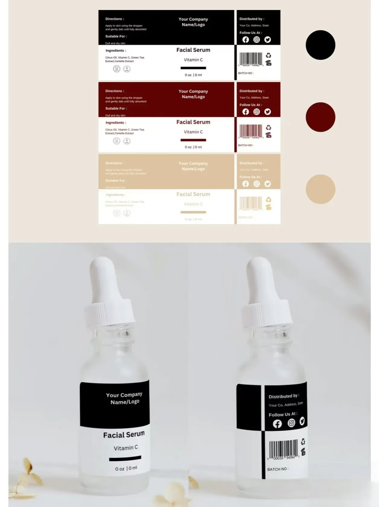 အမျိုးမျိုးသော ပရီမီယံပစ္စည်းများ၊ ရေစိုခံ တောက်ပသော ဗီနိုင်း၊ matte စက္ကူ၊ eco-friendly kraft paper နှင့် transparent film အပါအဝင် 20ml ပုလင်းတံဆိပ်များ။JOJO Pack များ20ml ပုလင်းတံဆိပ်များခိုင်ခံ့စေခြင်း၊ ခြစ်ရာများနှင့် အစိုဓာတ်ကို ခံနိုင်ရည်ရှိပြီး လိုဂိုများ၊ ထုတ်ကုန်အချက်အလက်၊ ပါဝင်ပစ္စည်းစာရင်းများနှင့် အသုံးပြုမှုလမ်းညွှန်ချက်များကို ရှင်းလင်းပြတ်သားစွာ ပုံနှိပ်ခြင်းအား သေချာစေသည့် ချောမွေ့သော ချောချောမွေ့မွေ့သော ပြီးမြောက်မှုတို့ ပါဝင်ပါသည်။ ကျွန်ုပ်တို့သည် CMYK ပုံနှိပ်ခြင်းနှင့် ရွှေနှင့်ငွေသတ္တုပါးရိုက်နှိပ်ခြင်း၊ UV အစက်အပြောက်အပေါ်ယံခြင်းနှင့် မတူကွဲပြားသောအမှတ်တံဆိပ်လိုအပ်ချက်များကိုဖြည့်ဆည်းပေးခြင်းတို့ကဲ့သို့သော အထူးလုပ်ငန်းစဉ်များကို ပံ့ပိုးပေးပါသည်။ စိတ်ကြိုက်အရွယ်အစားများနှင့် သင့်လျော်သောအမှားအယွင်းများမရှိသဖြင့်၊ ဤတံဆိပ်များသည် သင်၏ 20ml ထုတ်ကုန်များကို အပြိုင်အဆိုင်ဈေးကွက်တွင် ထင်ရှားပေါ်လွင်စေရန်အတွက် ပြီးပြည့်စုံသောထုပ်ပိုးမှုဖြေရှင်းချက်ဖြစ်သည်။
