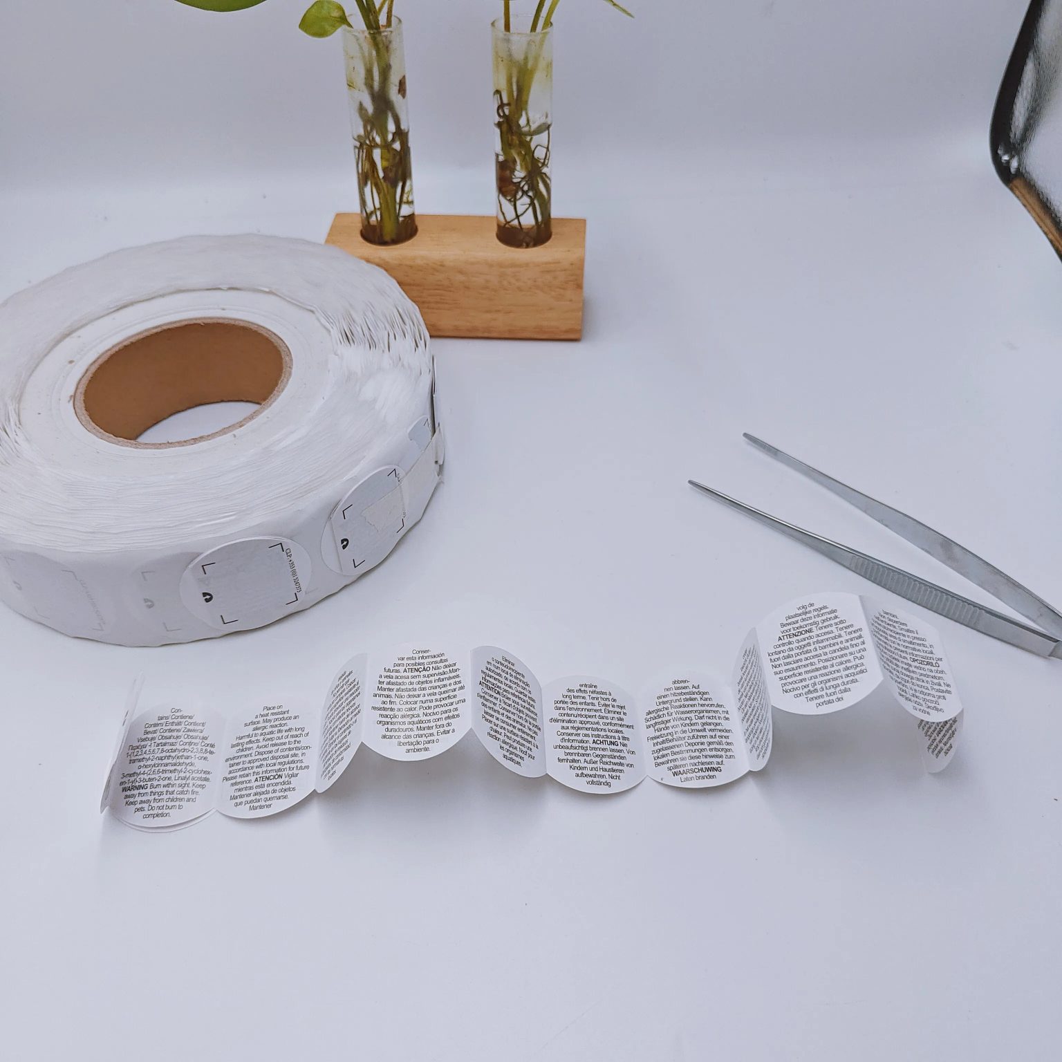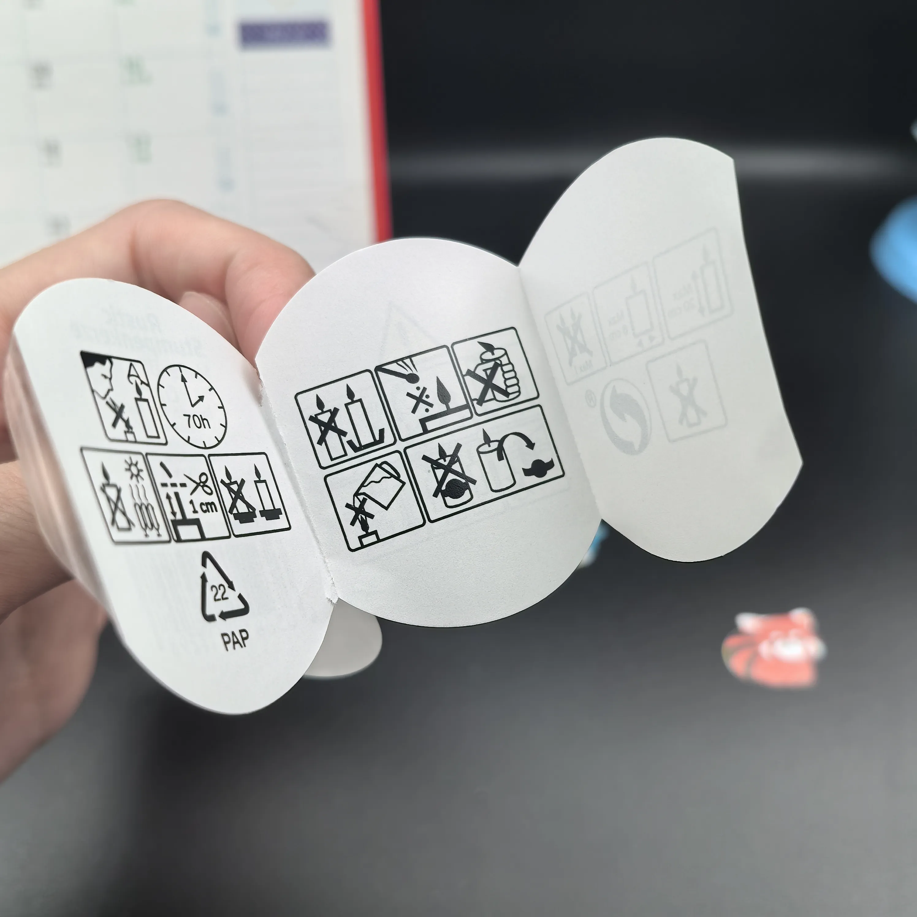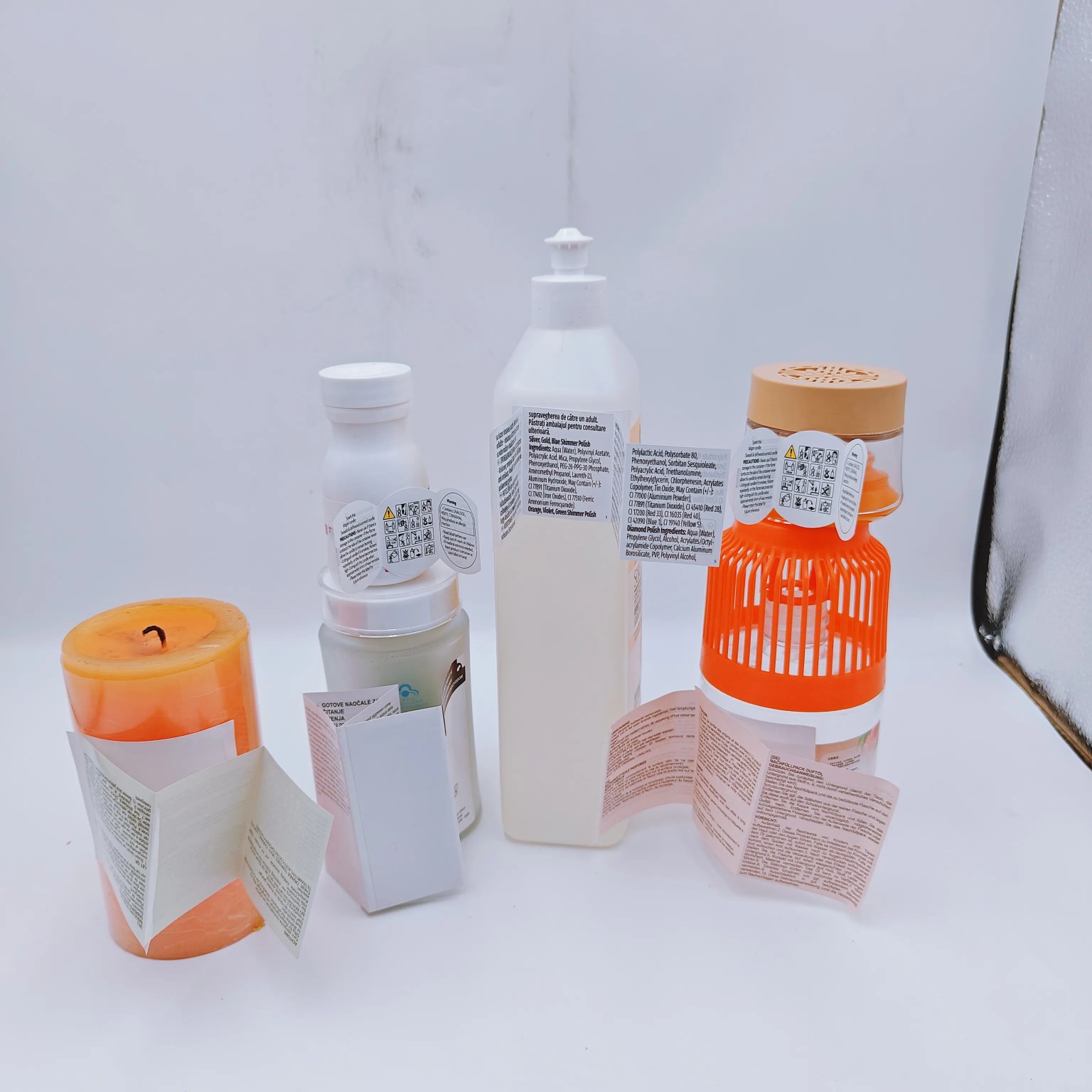 ဖယောင်းတိုင်၊ အလှကုန်၊ ဆေးဝါး၊ ပိုးသတ်ဆေး၊ အစားအသောက်၊ ကျန်းမာရေးစောင့်ရှောက်မှု၊ အီလက်ထရွန်းနစ်အသုံးပြုသူလက်စွဲ ပက်ကေ့ခ်ျတံဆိပ်စတစ်ကာ။