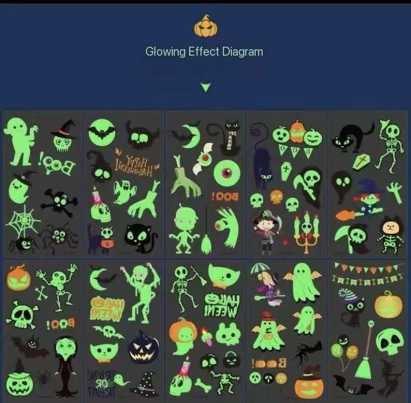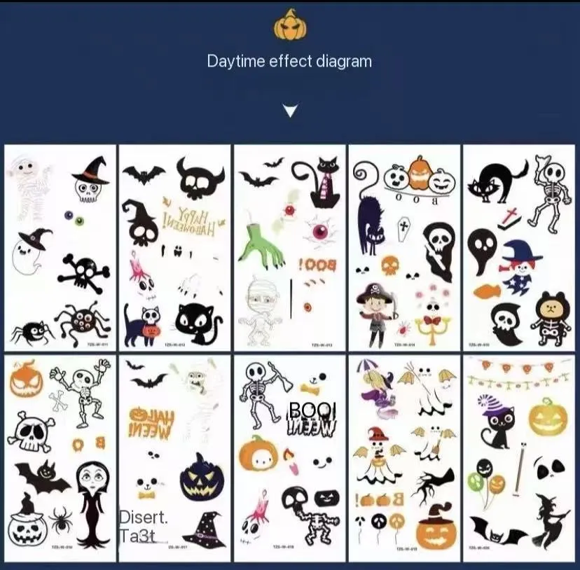 ဟယ်လိုဝင်းည Glow Tattoo စတစ်ကာများသည်ဟယ်လိုဝင်းအခမ်းအနားအတွက်အထူးဒီဇိုင်းပြုလုပ်ထားသောတီထွင်ဖန်တီးမှုအလှဆင်ပစ္စည်းများဖြစ်သည်။ ၎င်းကို Eco-Friendly Glow-the-the-dark မှင်ပစ္စည်းများဖြင့်ပြုလုပ်ထားပြီးခေတ်မှီတက်တူးထိုးပုံစံဒီဇိုင်းများကိုပေါင်းစပ်ထားသည်။ တစ်နေ့တာတွင်၎င်းသည်သဘာဝအရောင်သို့မဟုတ်အနက်ရောင်တက်တူးထိုးခြင်းအကျိုးသက်ရောက်မှုကိုတင်ပြနိုင်ပြီးညအချိန်တွင်၎င်းသည် Halloween ပါတီများ, လမ်းပရဒိနှင့်အဖြစ်အပျက်များတွင်အလွယ်တကူအာရုံစူးစိုက်မှုစင်တာသို့အလွယ်တကူအာရုံစူးစိုက်စေနိုင်သည်။ သငျသညျ spooky နှင့် amirky တစ်ဆေဒီဇိုင်းဒီဇိုင်းကိုရှာဖွေနေသို့မဟုတ်လျှို့ဝှက်ဆန်းကြယ်နှင့်ရင်ခုန်စရာမှောင်မိုက်သောလေထုကိုပိုနှစ်သက်သို့မဟုတ်လျှို့ဝှက်ဆန်းကြယ်နှင့်ရင်ခုန်စရာမှောင်မိုက်သောလေထုကိုပိုနှစ်သက်သည်ဖြစ်စေ, နာကျင်မှုနှင့်ထာဝရတည်တံ့ခိုင်မြဲမှုများကိုသည်းမခံဘဲမျက်စိဖြင့်ဖမ်းမိသောဟယ်လိုဝင်းဝတ်ထားသည့်မတ်တပ်တစဉ်တွင်သင်ခံစားနိုင်သည်။