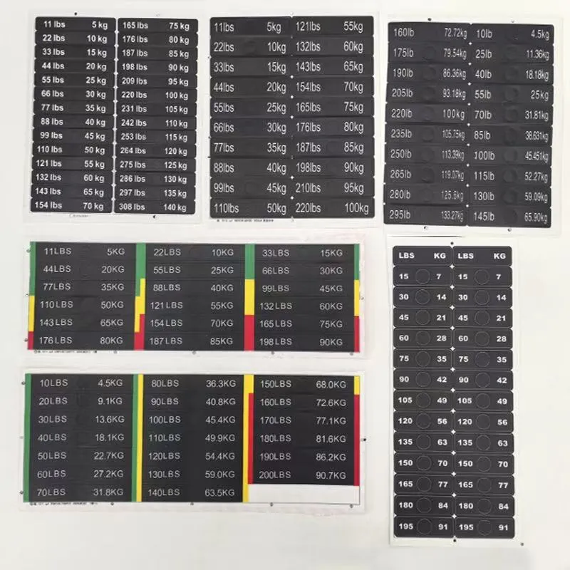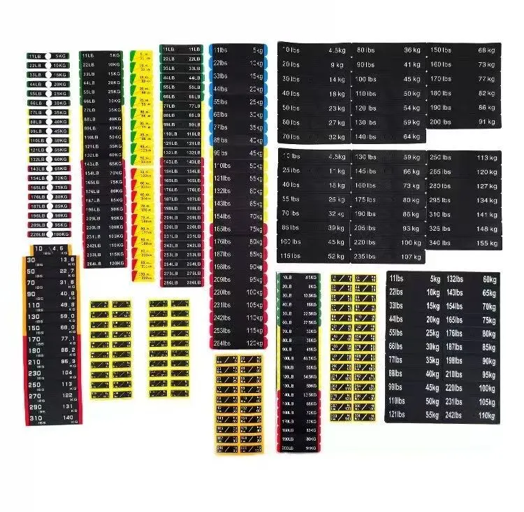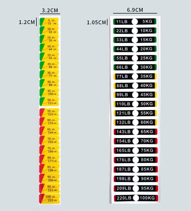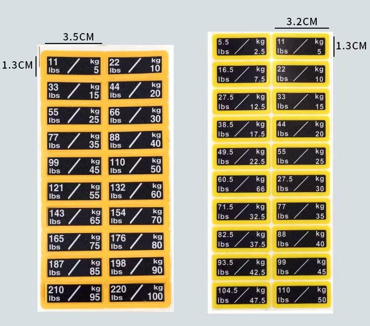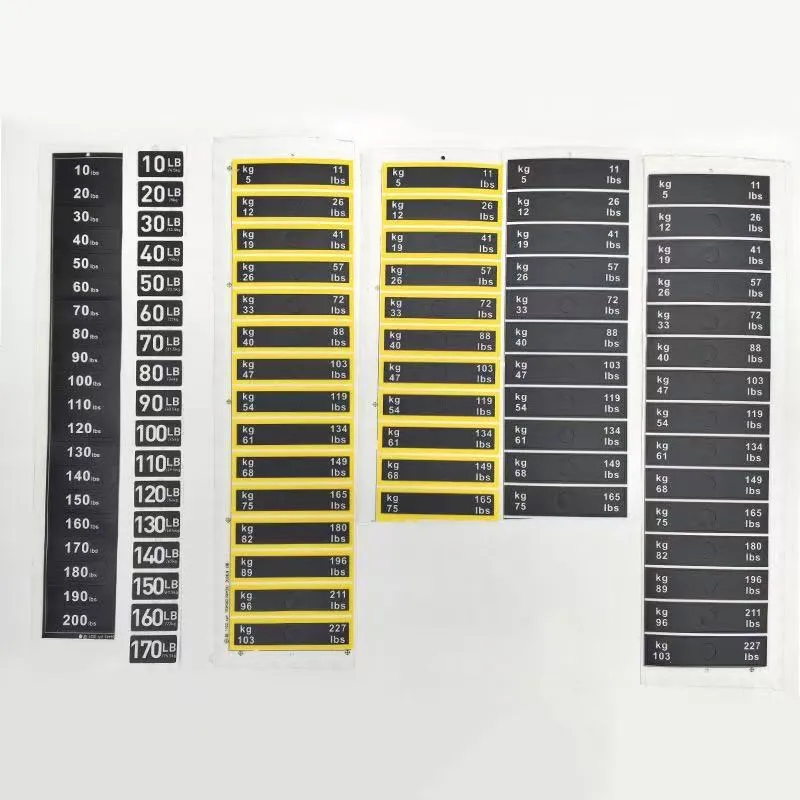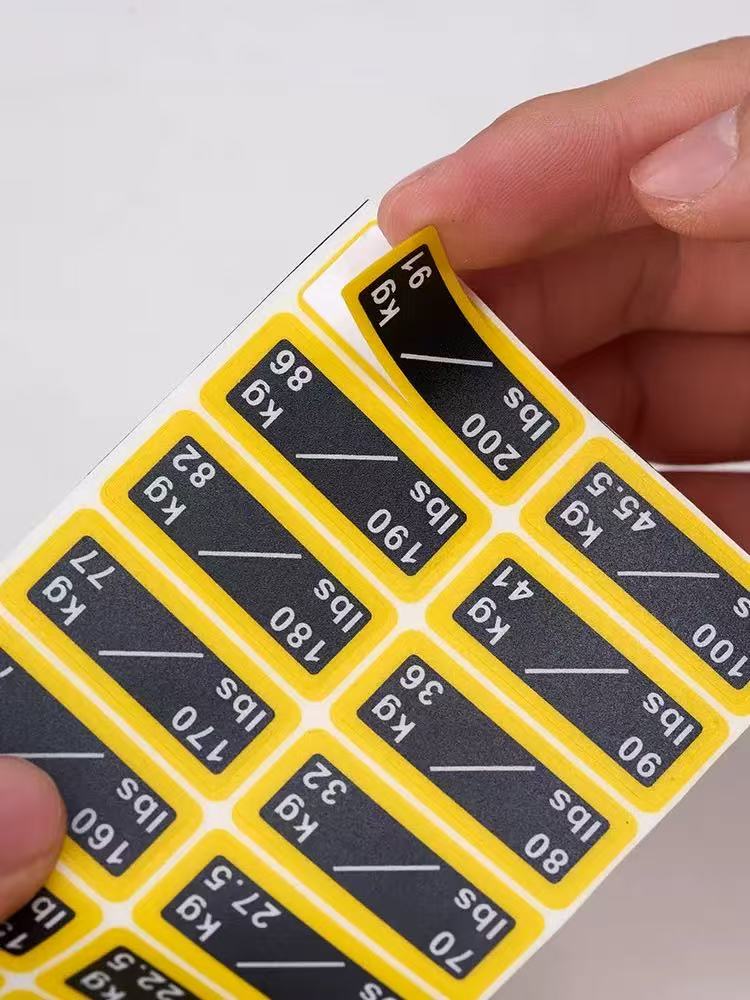 ကြံ့ခိုင်ရေးကိရိယာအလေးချိန်တုံးများအတွက် ဤအလေးချိန်စတစ်ကာများသည် ကြံ့ခိုင်ရေးဂီယာ၏အလေးချိန်ကိုတံဆိပ်ကပ်ရန်အတွက် အထူးဒီဇိုင်းထုတ်ထားသည့် သက်သေခံစတစ်ကာအမျိုးအစားတစ်ခုဖြစ်သည်။ ၎င်းတို့ကို အများအားဖြင့် PVC ပစ္စည်းဖြင့် ပြုလုပ်ထားပြီး တိကျသောအတိုင်းအတာများအတွက် ထုတ်ကုန်ဘောင်ဇယားကို ကိုးကားနိုင်ပါသည်။ အလေးချိန်တန်ဖိုးများကို စတစ်ကာများတွင် ရှင်းရှင်းလင်းလင်း မှတ်သားထားပြီး အသုံးပြုသူများအား သင့်လျော်သော လေ့ကျင့်ရေးအလေးချိန်ကို လျင်မြန်စွာ ခွဲခြားသတ်မှတ်နိုင်စေပါသည်။